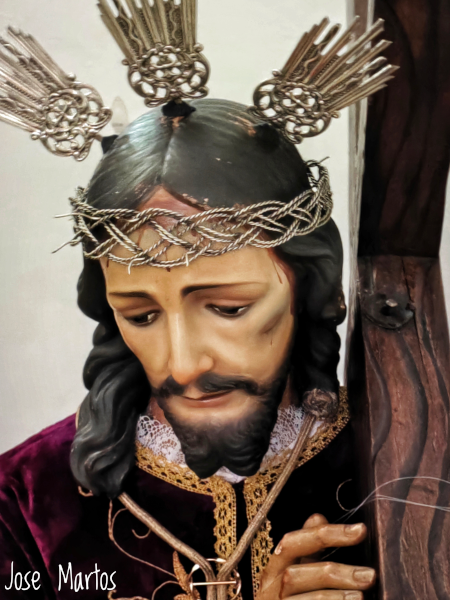 Del mismo modo, en consonancia con los modelos iconográficos del círculo de los Mora, en los que se inspira José Navas Parejo, se configura una imagen de un Cristo paciente, de mirada baja y ensimismada, que transmite una actitud de aceptación serena del sufrimiento. Esta interpretación, heredera de la tradición granadina, se caracteriza por la contención expresiva y la introspección psicológica, alejándose de los excesos dramáticos para centrarse en la dimensión espiritual de la Pasión. La imagen, concebida como objeto de culto, suscita en el fiel una respuesta emocional basada en la compasión y en un dolor contenido, acorde con los ideales devocionales que la inspiran.